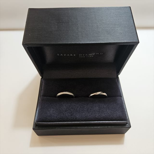 夫が贈ってくれた婚約指輪と同じブランドにしました。デザインはとても悩みましたが(とはいえその日のうちに)、手元をキラキラしたかったので指輪にいくつかダイヤモンドが入っているものにしました。予算は1人15万円前後で考えておりその範囲内で購入。当時は結婚指輪といえばプラチナでしょうと思っていましたが、今思えばイエローゴールドのほうが肌の色に馴染んでて素敵だったなと思ったりします(予算オーバーの可能性もありますが)。